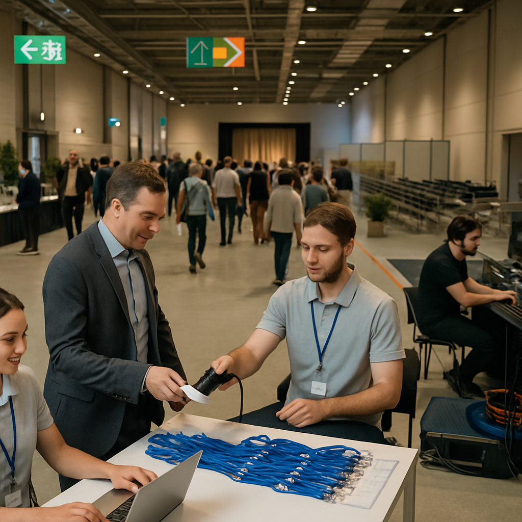 Unausweichlich, aber oft vernachlässigt: Kabelmanagement. Ordentliche Kabelführungen, farbcodierte Leitungen und Kabelbrücken an Besucherwegen reduzieren Unfälle und Ausfallrisiken. Beim Netzwerk denken Sie an mehrere SSID-Stränge: ein dediziertes Netzwerk für Produktion/Streaming, ein gesichertes Netzwerk für Aussteller und ein separates Gast-WLAN mit geeigneter QoS.